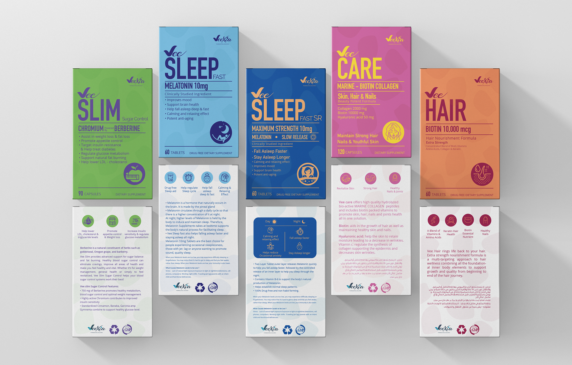 Veexia is a pharmaceutical company with a strong presence in Dubai and Cairo. Veexia's packaging design project aimed at promoting health and wellness through innovative products, including cutting-edge supplements and cosmetics in dermatology and nutrition, catering to consumers in the Middle East and North Africa. Veexia's commitment to using the latest scientific discoveries has established them as a leading player in the industry. Contributing to their vision was an exciting opportunity to be part of their efforts to promote well-being.